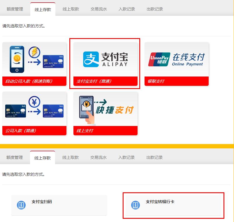 电脑用户点击右上角登入,登入会员账号,点击屏幕右上方的线上存款。再点击支付宝支付(普通),选择支付宝转银行卡