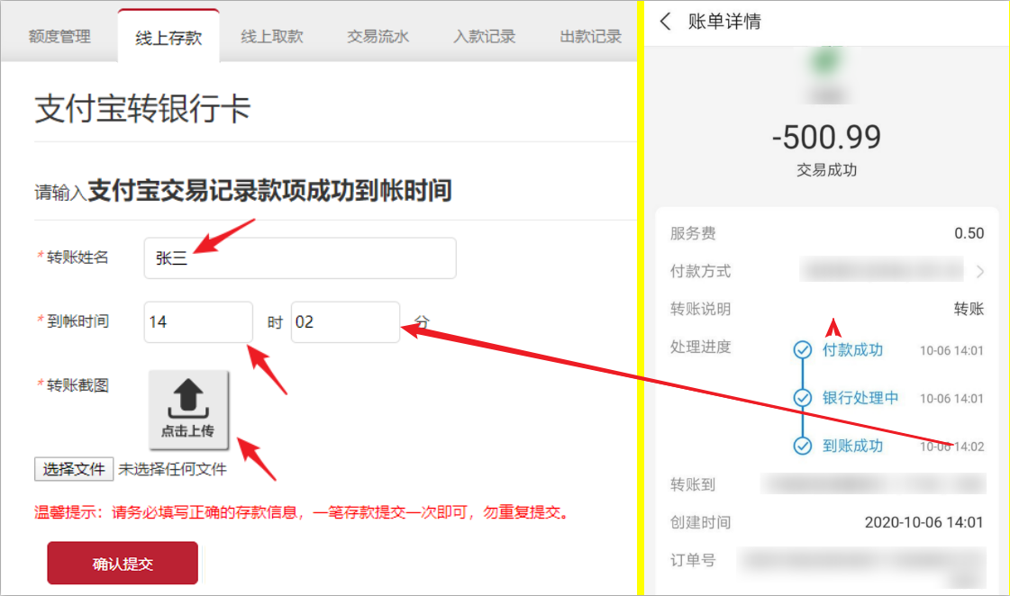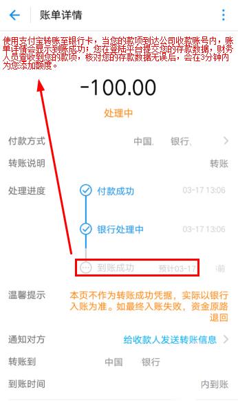 请您使用支付宝进行转账(转账金额务必与您填写的转账金额一致);到账成功后按照提示填写转账姓名(即:支付宝绑定的姓名)、到账时间(以实际支付宝提示的到账时间为准),并上传您的转账详情截图,在点击确认提交(温馨提示:使用支付宝转账至平安银行是即时到账的; 务必先确认到账后,填写准确到账时间,再点击提交,否则财务人员查询不到款项无>法第一时间帮您添加额度。)