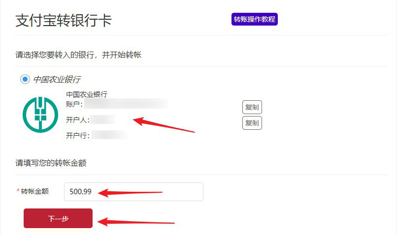 请您记录好公司收款银行账户,填写您的转账金额,点击下一步。